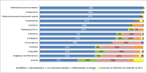La situación difiere en el caso de los medicamentos de mayor consumo en la población general ya que son estos los que presentan la menor tasa de recomendación médica. En el caso de los antibióticos, el 74% del consumo viene por indicación de un profesional de la salud. Un 16% declara que los consume por el hecho de hacerlo siempre y el 6% dice utilizarlo por consejo del farmacéutico.
