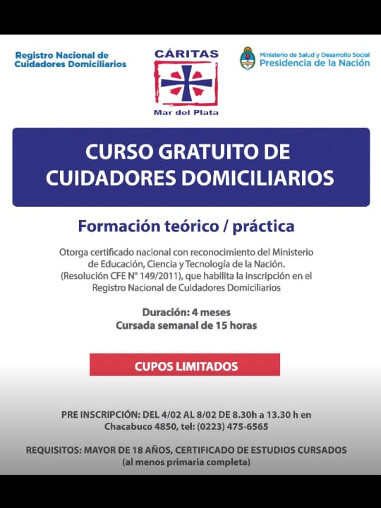 El Ministerio de Salud y Desarrollo Social de la Nación  a través de Cáritas Mar del Plata comenzará a dictar en Mar del Plata el curso gratuito de cuidadores domiciliarios que otorga certificado nacional con reconocimiento del Ministerio de Educación, Ciencia y Tecnología de la Nación bajo la resolución Nº 149/2011 que habilita la inscripción en el Registro Nacional de…